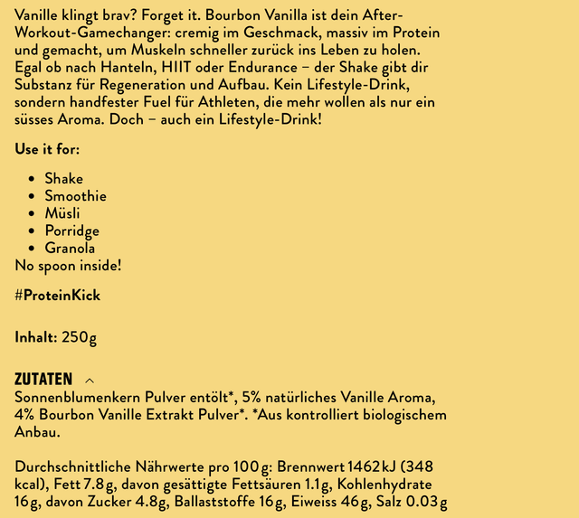ZUTATEN: Sonnenblumenkern Pulver entölt*, 5% natürliches Vanille Aroma, 4% Bourbon Vanille Extrakt Pulver*. *Aus kontrolliert biologischem Anbau.