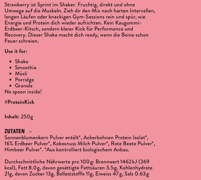 ZUTATEN: Sonnenblumenkern Pulver entölt*, Ackerbohnen Protein Isolat*, 16% Erdbeer Pulver*, Kokosnuss Milch Pulver*, Rote Beete Pulver*, Himbeer Pulver*. *Aus kontrolliert biologischem Anbau.